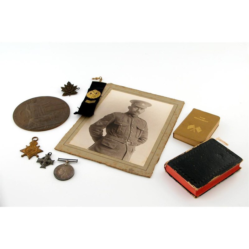 World War I, a casualty pair of medals to a Canadian recipient, 1914-15 Star and War medal (71135 Sjt. E. E. Andrews. 27 / Can. Inf.); with Death Plaque (Ernest Edward Andrews); and Memorial Cross (71135 Sjt. E. E. Andrews); badges (2), Cameron Highlanders of Canada and City of Winnipeg XXVII Battn; also with studio photograph and his army New Testament and Prayer Book. Medals extremely fine. (Lot)