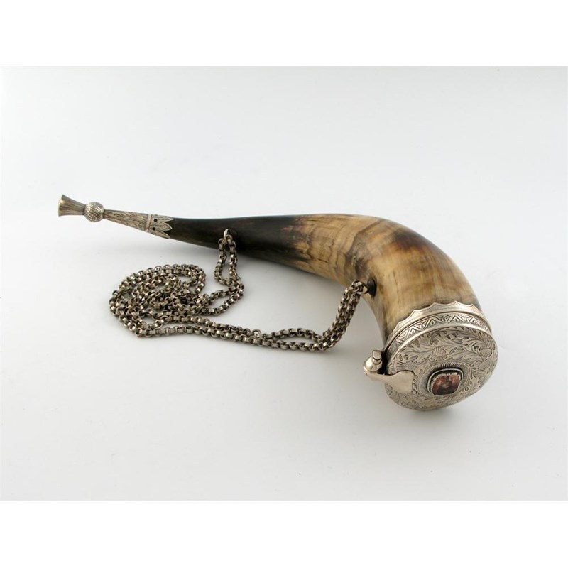 the hinged cover with chased thistle decoration and set with a Cairngorm, the horn body applied with a vacant cartouche and terminating in a thistle end, with a chain, length 38cm.