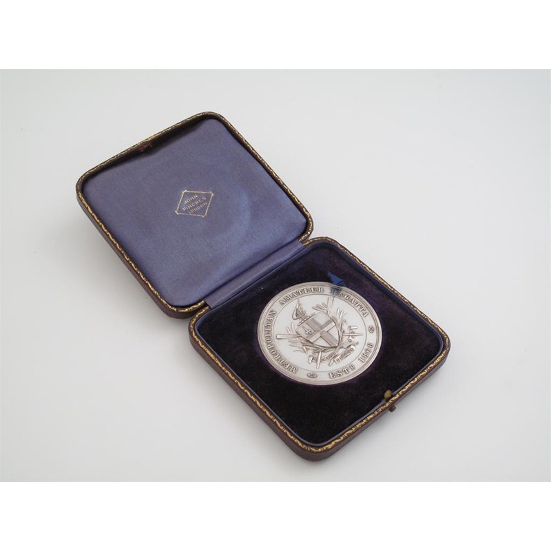 struck with a trophy and 'Metropolitan Junior Eight Oared Challenge Cup', the the reverse with an armorial, crossed oars and 'Metropolitan Amateur Regatta, Estd 1866', in a fitted case, diameter 5.8cm.