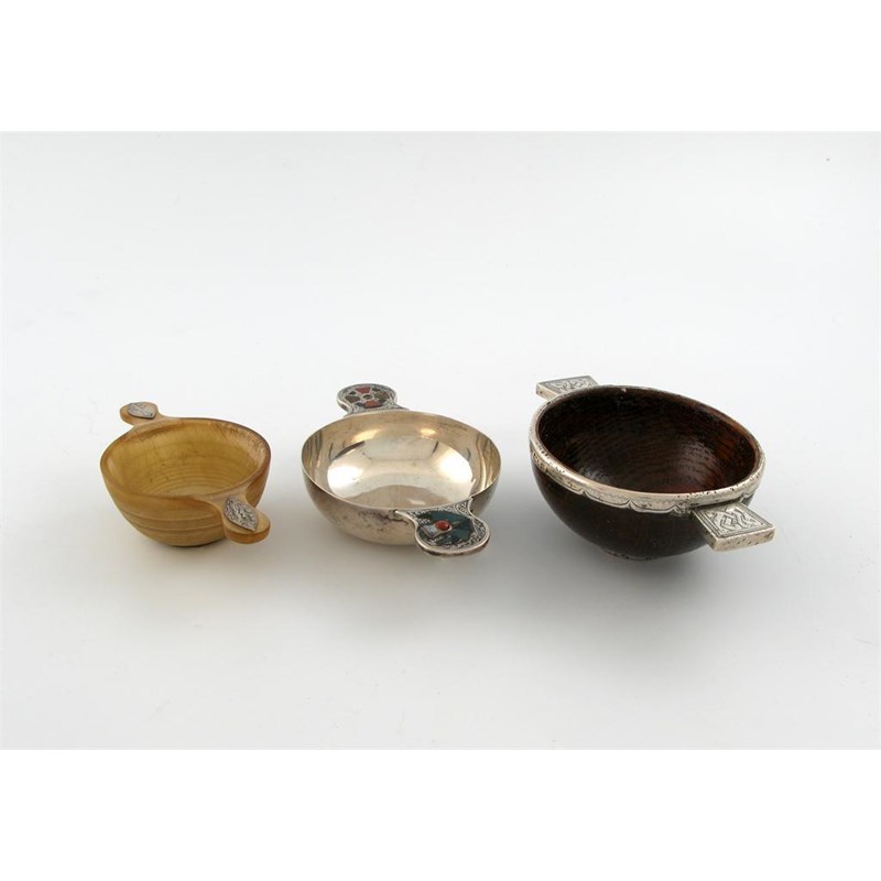 circular form, the centre set with a coin, plain silver rim, the handles with Celtic decoration, diameter 7.5cm.