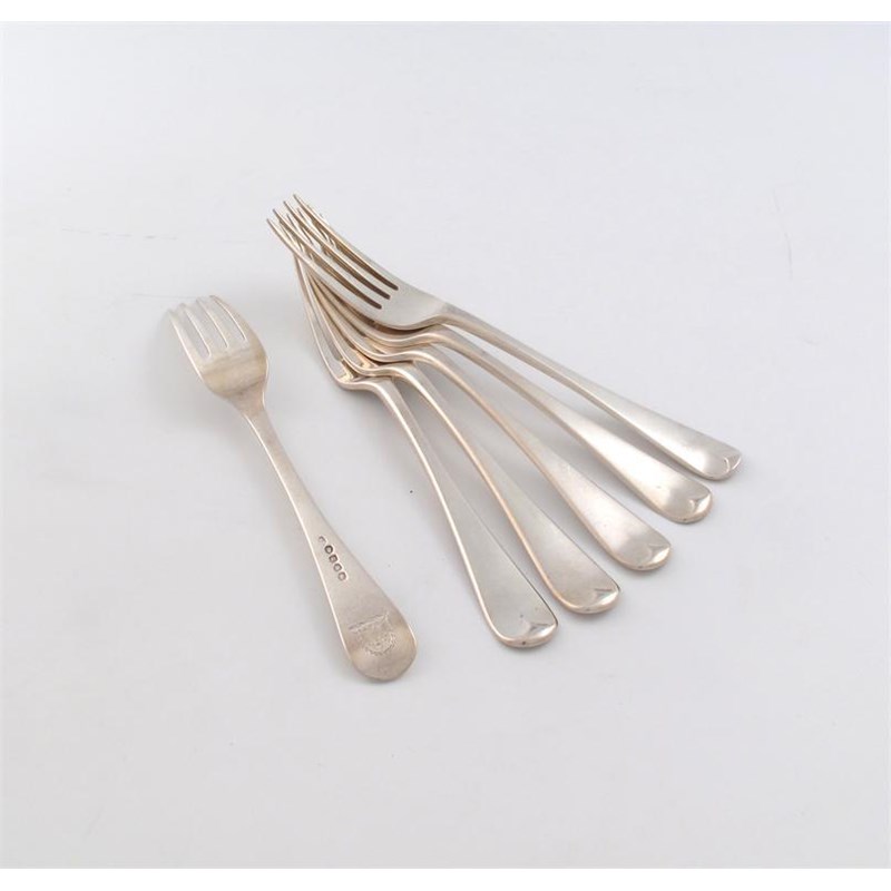 A matched set of six George III and William IV silver old English pattern table forks