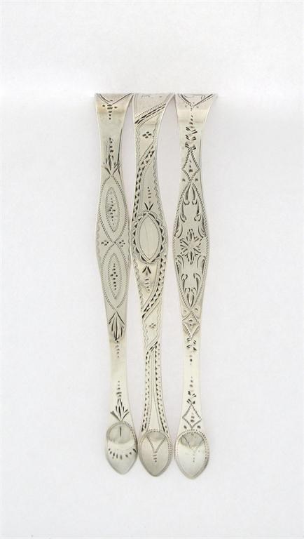 Three pairs of George III silver bright-cut sugar tongs,
