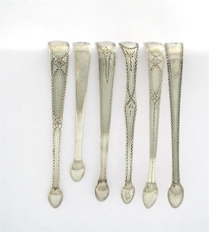comprising: five pairs with bright-cut decoration, and a plain pair, majority initialled or monogrammed, approx. weight 6oz. (6)