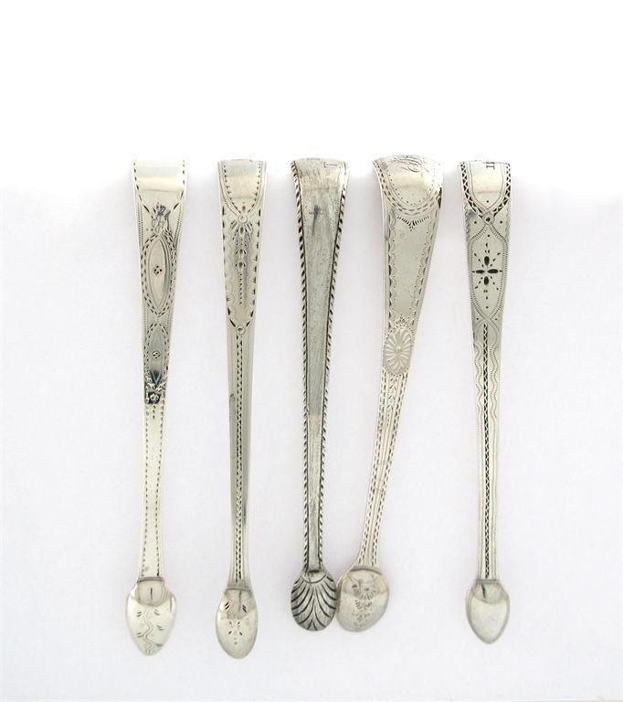 A collection of five pairs of George III silver bright-cut sugar tongs,