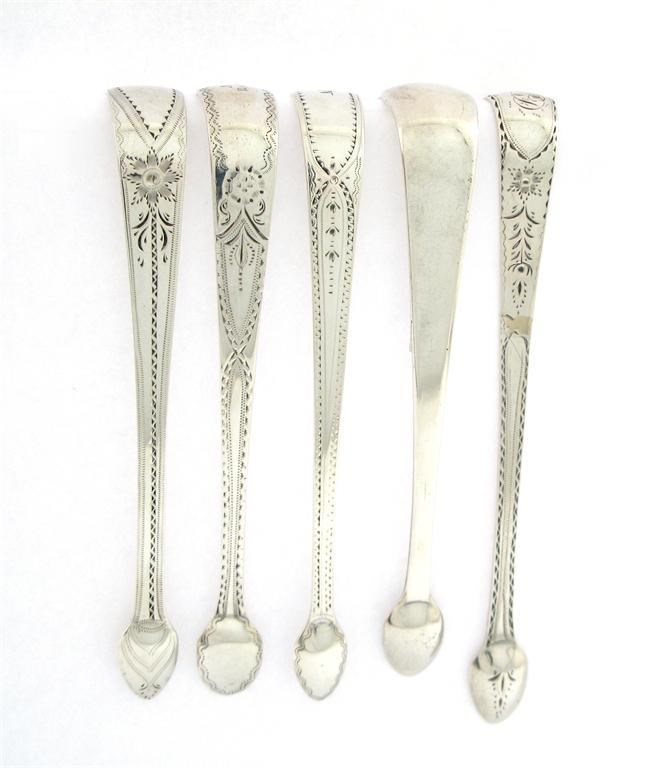 comprising; four pairs with bright-cut decoration, and a pair of plain form, the majority initialled and monogrammed, approx. weight 5oz. (5)