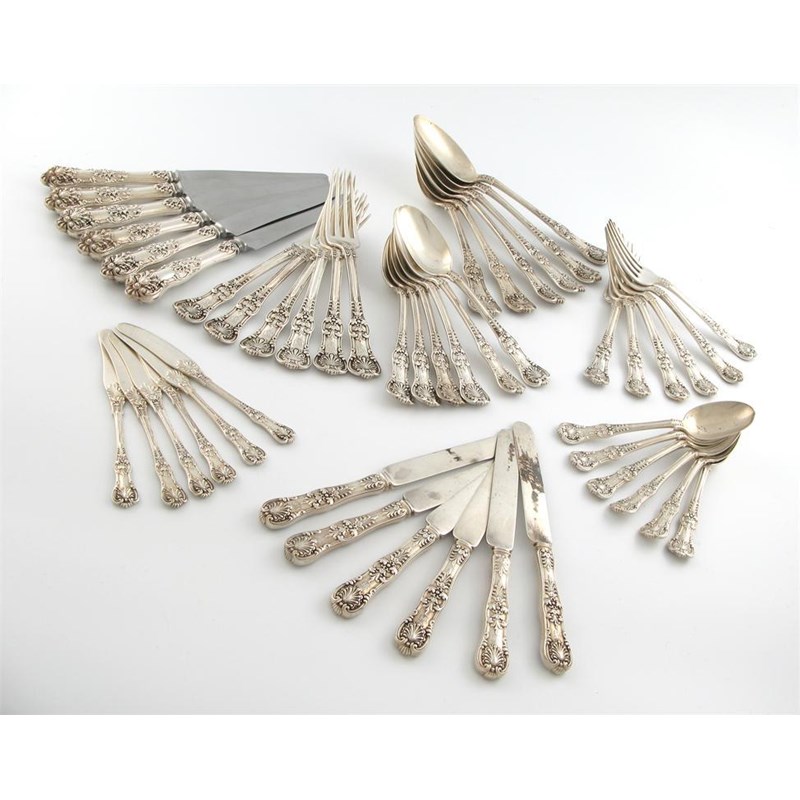comprising: six tablespoons, six tableforks, six dessert spoons, six dessert forks, six teaspoons, six table knives, six dessert knives, and six butter knives, the terminals engraved with a monogram, approx. weighable 92oz. (48)