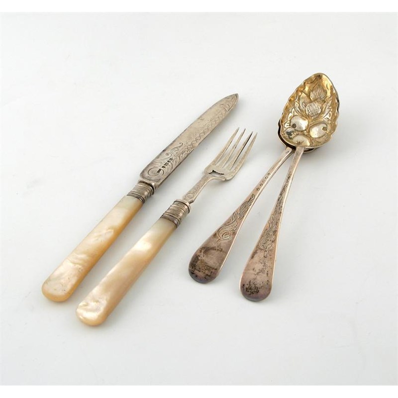 with mother-of-pearl handles, the blade with engraved decoration, plus two George III