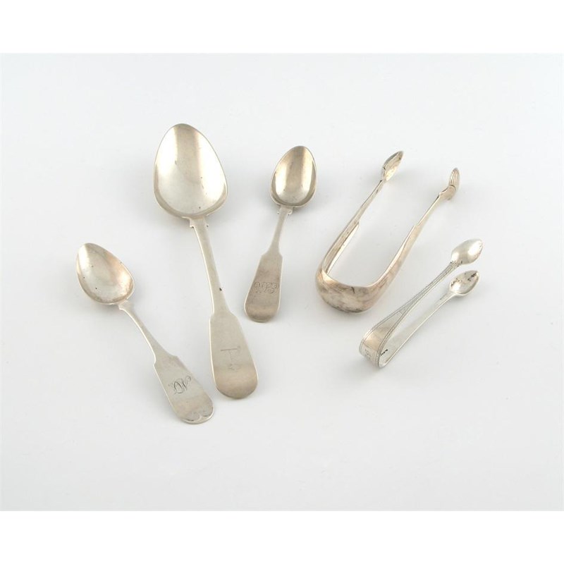 Fiddle pattern dessert spoons, sugar tongs, and two teaspoons, one by Baily & Co, c.1850, and a pair of bright-cut sugar tongs,