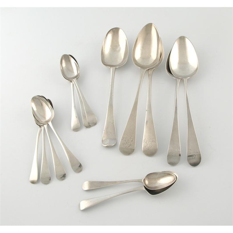 two George III pairs of tablespoons, three George III teaspoons, a set of six modern teaspoons by Walker & Hall, Sheffield 1906, and a George III Hanovarian pattern tablespoon.