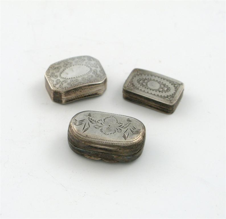 rectangular form, canted corners, engraved decoration, plus two further small vinaigrettes, approx. weight 0.7oz. (3)