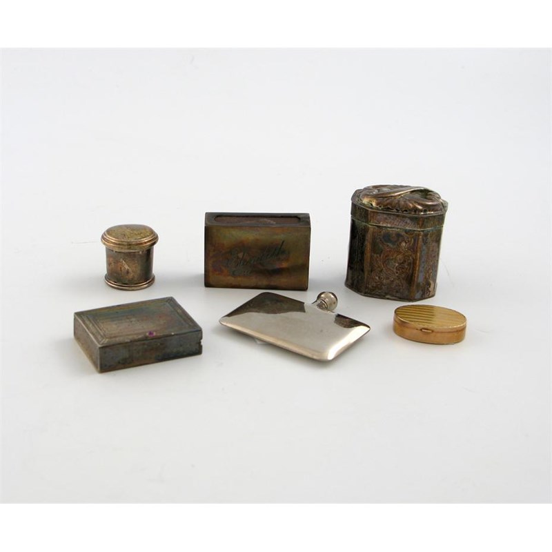 comprising a French vesta box, with engine turned decoration, an unmarked spice box, probably 18th century, a Dutch box, a match box cover, a 9 carat gold pill box, cover a.f, and a base metal scent flask, approx. weight of gold 8g. (6)