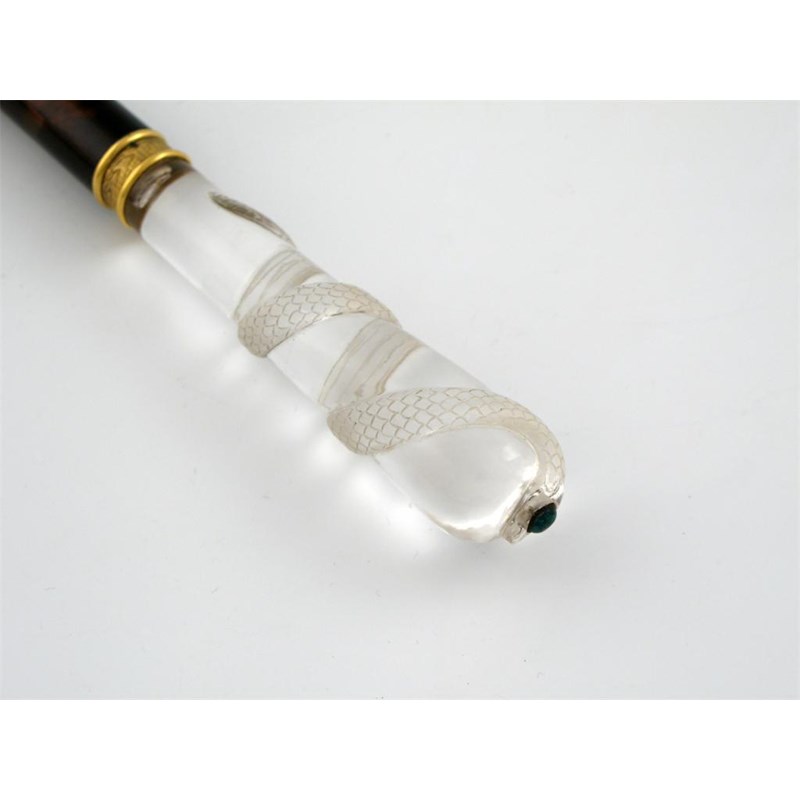 tapering circular form, the rock crystal carved with a snake and with a green stone finial, length 30.5cm.