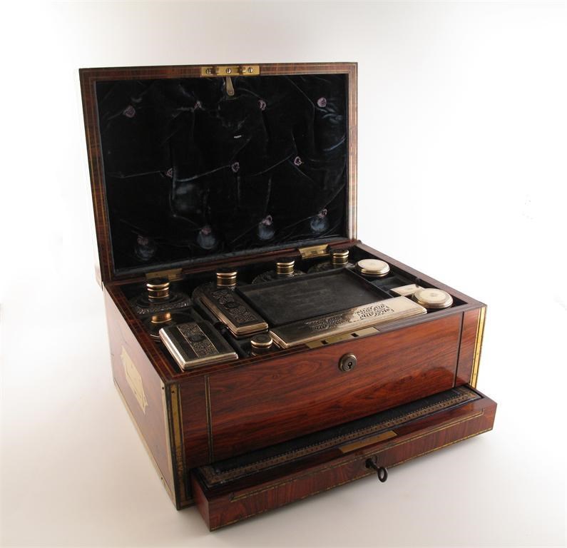 with engraved Greek key borders, some covers with pierced foliate scroll decoration, monogrammed, comprising: a snuff box, four unmarked mounted scent bottles, and six various toilet jars, in a fitted brass bound rosewood travelling case with a drawer, length 35.8cm.