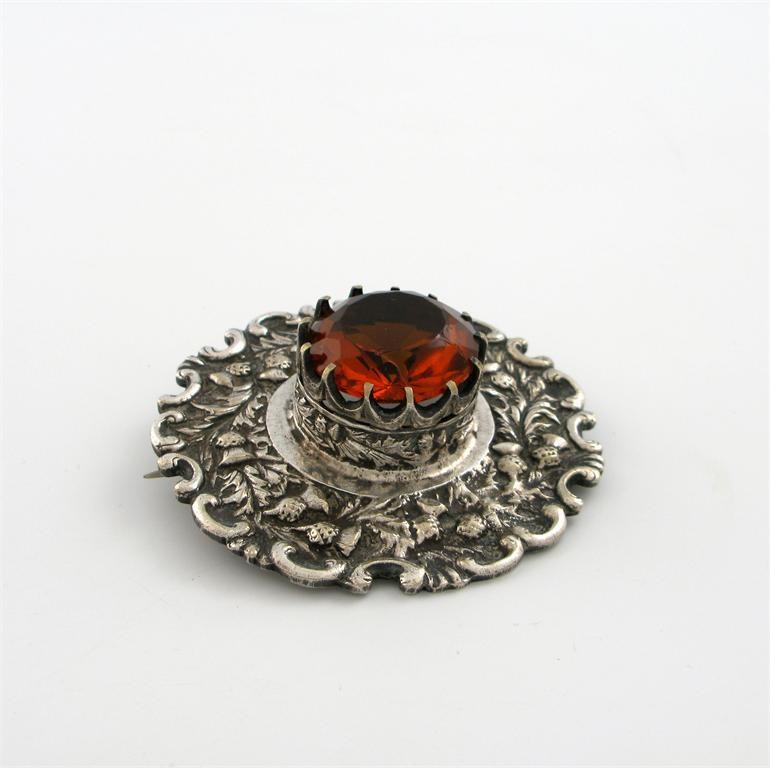 circular form with thistle and scroll decoration, and set with a central orange glass cabochon, diameter 9.2cm.