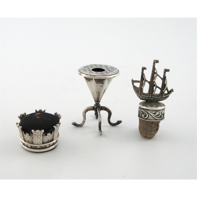 on three tripod legs, plus a bottle stopper modelled as a galleon, import marks for London 1930, plus an unmarked pin cushion modelled as a crown. (3)
