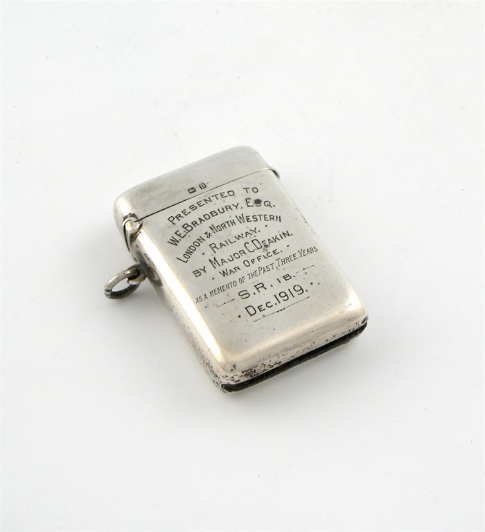oblong with rounded corners, hinged covered, suspension loop, engraved 'Presented to W E Bradbury Esq, London & North Western Railway by Major C Deakin, War Office, as a memento of the past three years, S R Dec 1919'
