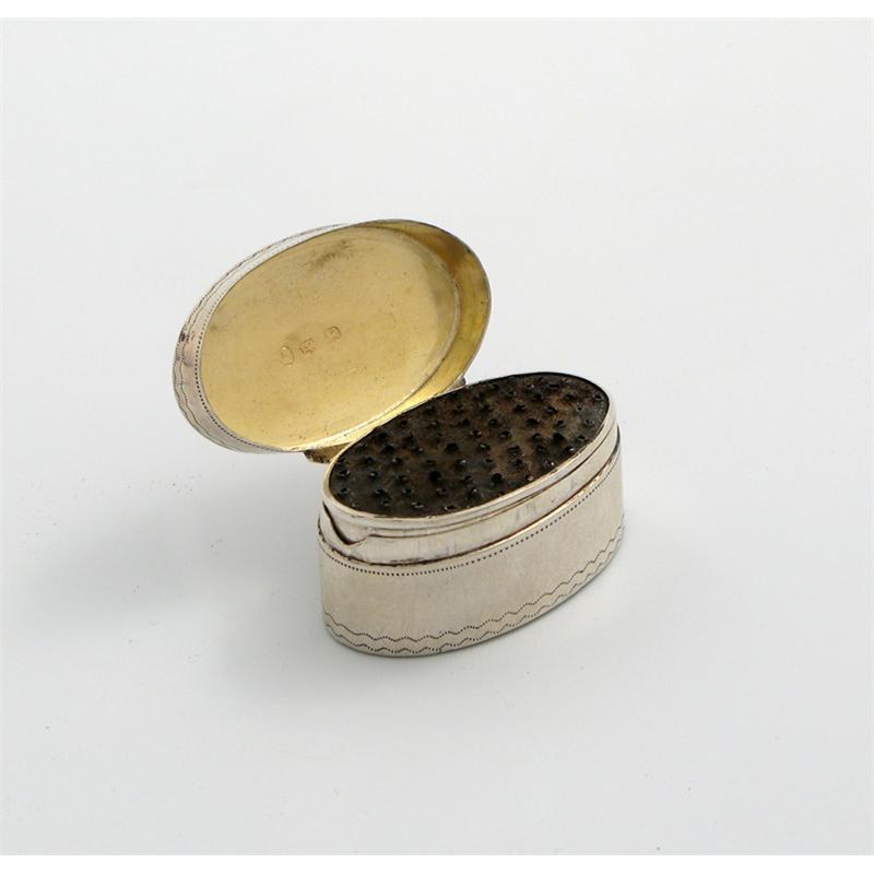 oval form, bright-cut borders, the hinged cover with wriggle-work and with a Greek key border, the interior with a later hinged grater and later gilding, length 4.6cm, approx. gross weight 28.9 g.