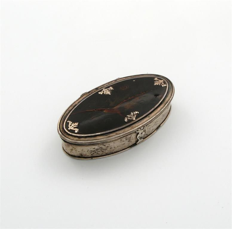 oval navette form, the hinged cover with foliate mounts, damage to tortoiseshell, length 8.2cm.