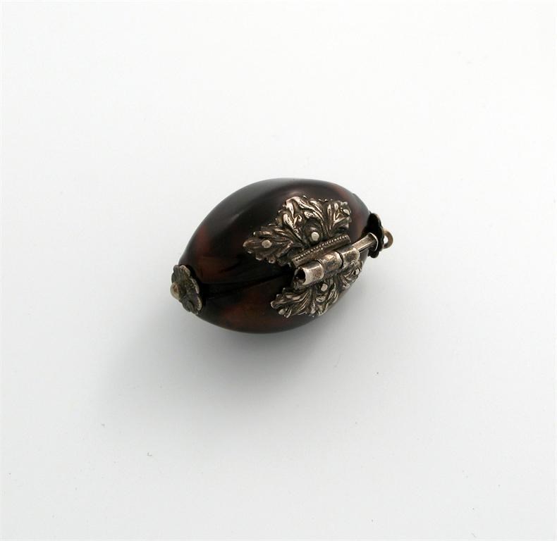 oval form, foliate mounts and hinged cover, with a ring loop, plus four later miniature dice, length 3.8cm.