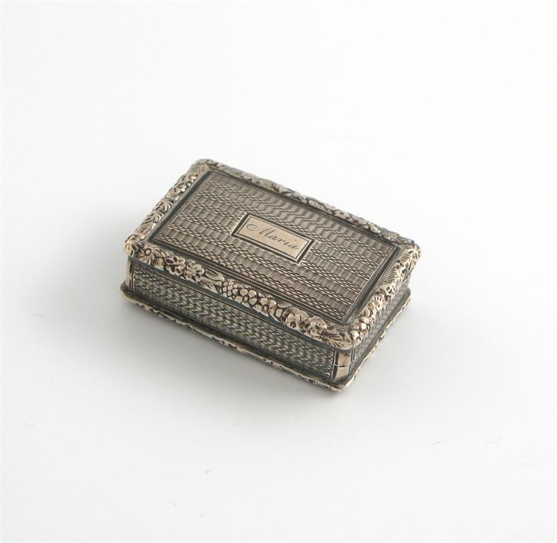 with raised floral borders and engine turned decoration, oblong central plaque engraved 'Maria', gilt interior, pierced grille,