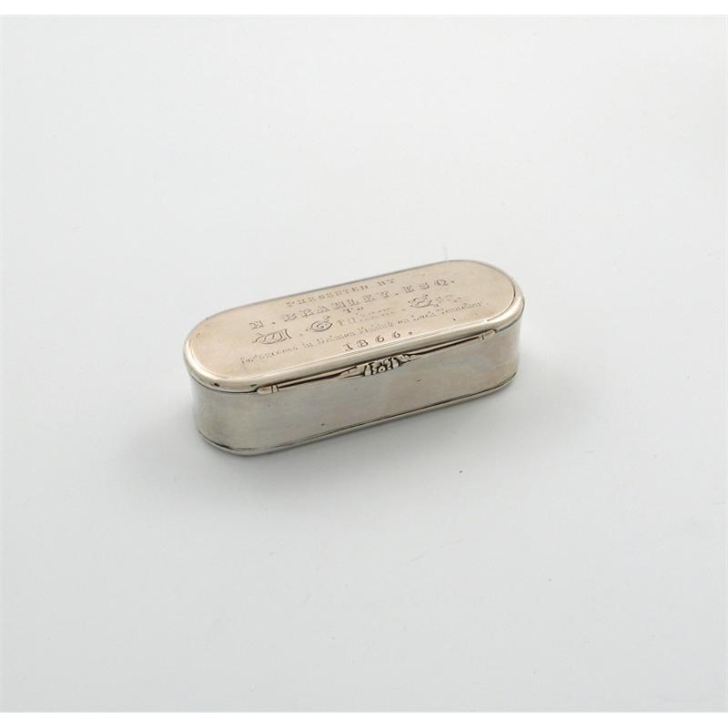 rounded rectangular form, the hinged cover inscribed, 'Presented by H. Bramley. Esq. to W. Graham Esq. for success in salmon fishing on Loch Venachar', length 9.7cm, approx. weight 3.8oz.