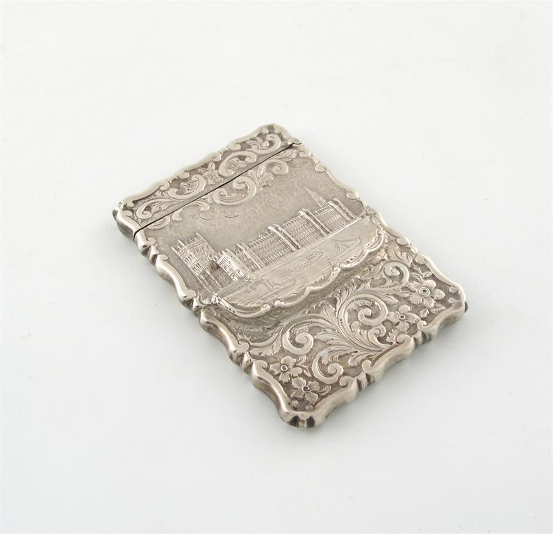 with a view of the Houses of Parliament and the Thames and river traffic in the foreground, flanked by chased floral scrolls, (fitted case),