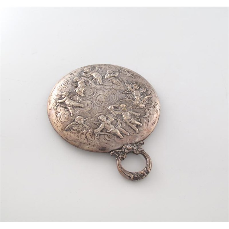 circular form, embossed cherub decoration, shell capped scroll handle, diameter 15cm.
