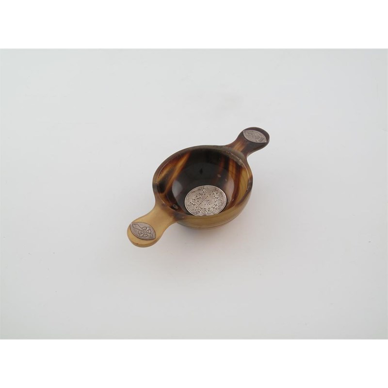 circular form, lug handles, with engraved decoration of a thistle, cross and with an engraved central boss, length handle to handle 13.8cm.