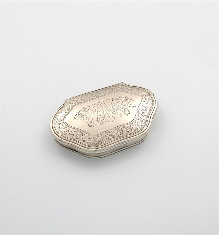 cartouche form, the hinged cover with engraved decoration, length 7.5cm, approx. weight 1.7oz.