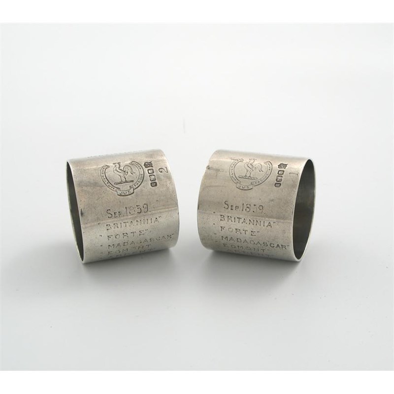 circualr form, engraved with a crest and 'Sept 1859' 'BRITANNIA' 'FORTE' 'MADAGASCAR' 'EGMONT' 'ARDENT' 'VICTORY' 'RESISTANCE' 'AURORA' 'WOLVERENE' 'MEEANNE' 'RODNEY' 'HART' 'SIRIUS' 'FAVORITE' 'HIMALAYA' 'EXCELLENT' 'CAMBRIDGE' 'HUMBER' 'FIREFLY' 'ORWELL' 'C.G.GALWAY' 'Jan 31ST 1890', approx. weight 3.4oz. (2)