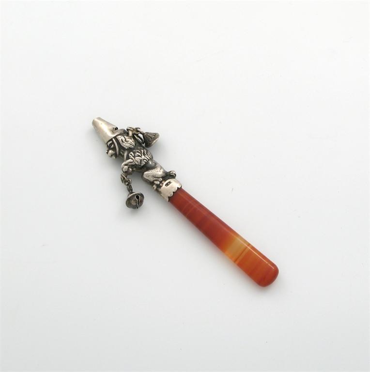 modelled as a begging dog wearing a dunce's hat, and with his possessions in a bag attached to a stick, agate handle, with two bells, (one damaged), length 11.5cm.