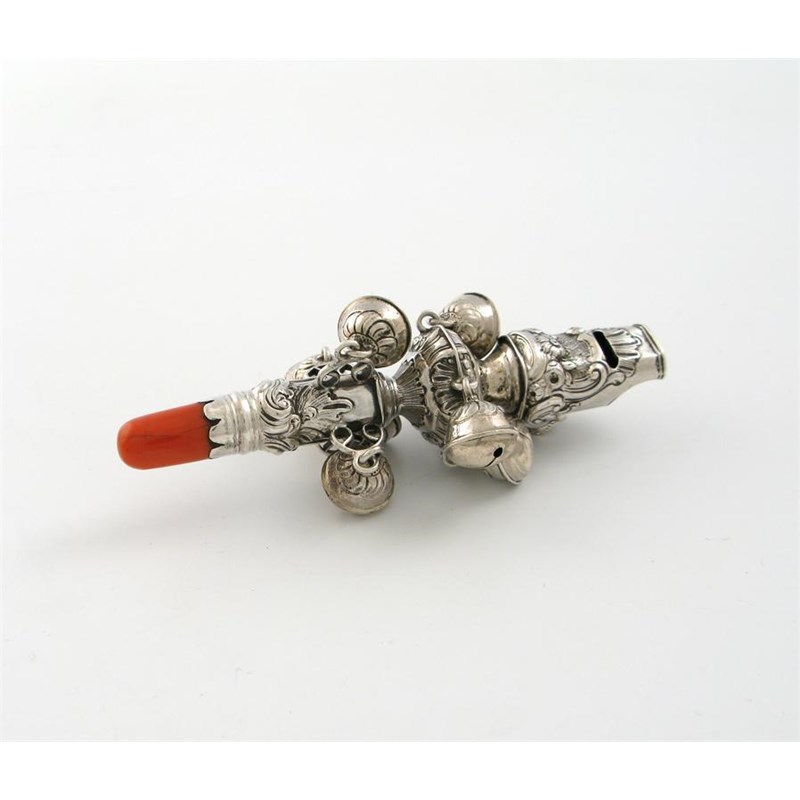 foliate decoration, coral teether, with eight bells, length 11.5cm.