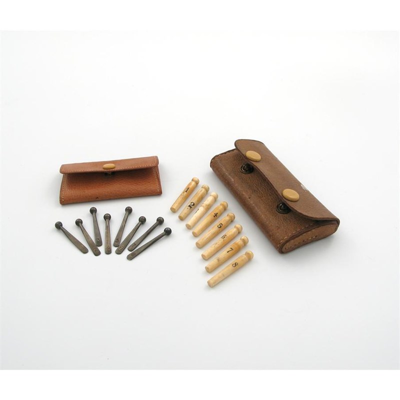 numbered 1-8, in a fitted pigskin case, plus a set of eight ivory butt markers, in a pigskin case. (2)