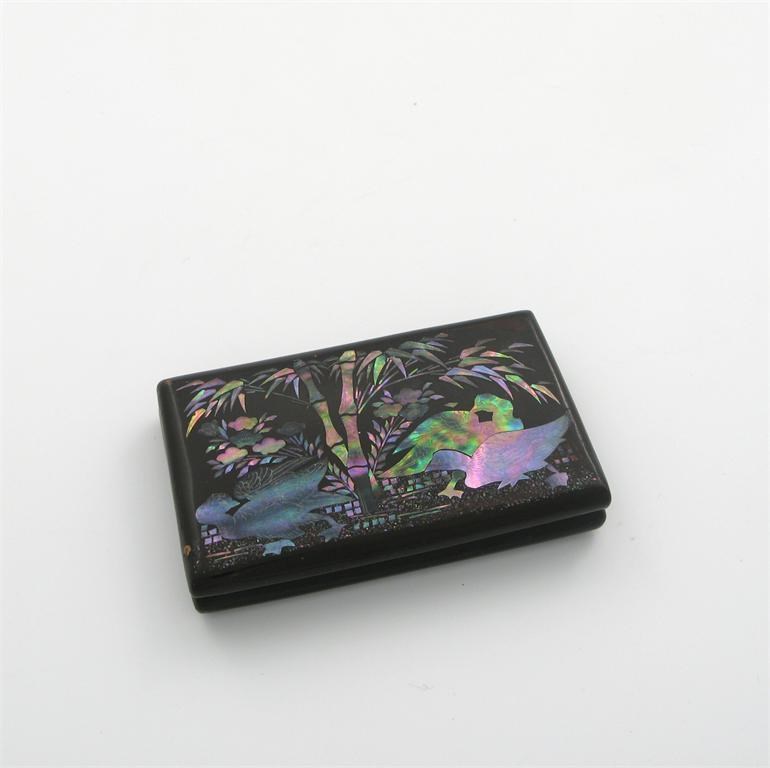 rectangular form, the hinged cover with mother-of-pearl birds in a landscape scene, the base with similar decoration, length 7.8cm.