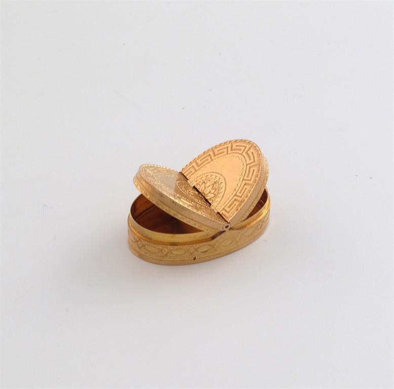 oval form, double flush hinged cover with a Greek key border and central flower, the side and base with similar decoration, engraved with a monogram, length 4cm, approx. weight 24g.