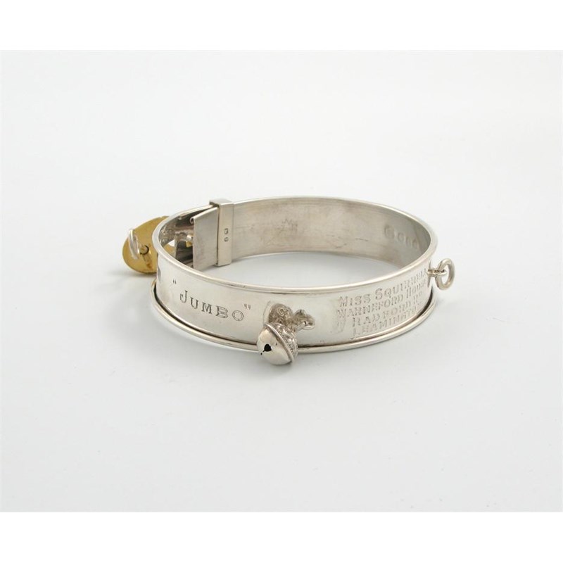 circular form, applied with three unmarked bells, and inscribed 'JUMBO' and 'MISS SQUIRRELL, WARNEFORD HOUSE, RADFORD ROAD, LEAMINGTON', with a brass padlock, diameter 8.8cm.