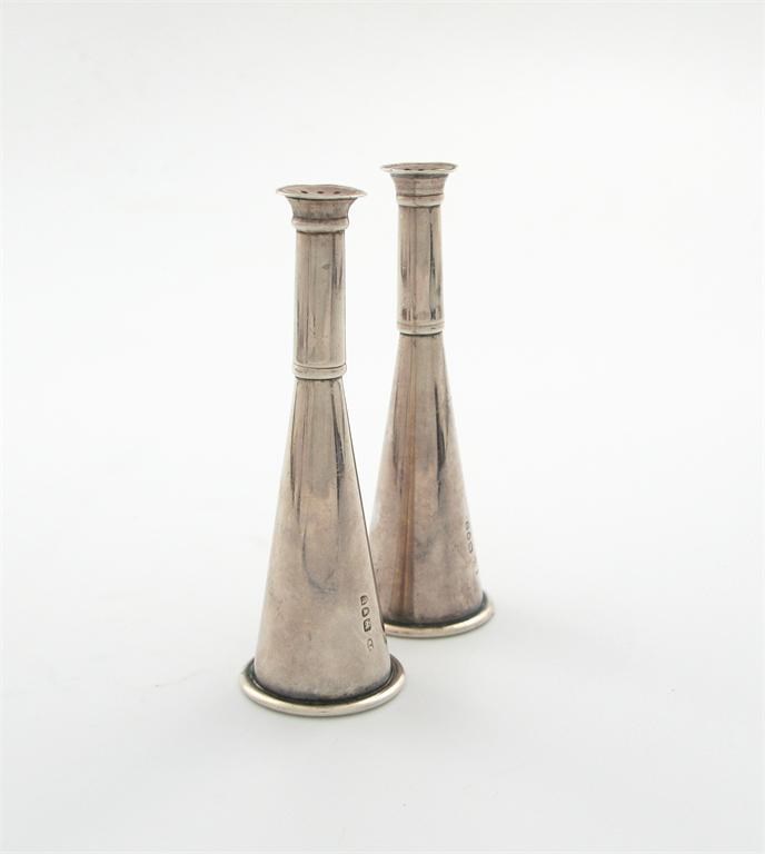 A pair of Victorian novelty silver hunting horn pepper pots,