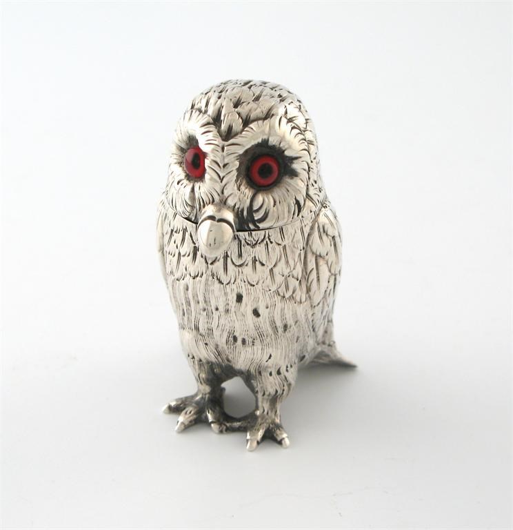 modelled as a standing owl, hinged head set with glass eyes, height 8.8cm, approx. weight 3.5oz.
