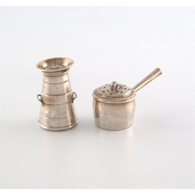 modelled as a sauce pan, plus a novelty silver pepper pot modelled as a milk churn, approx. weight 0.8oz. (2)