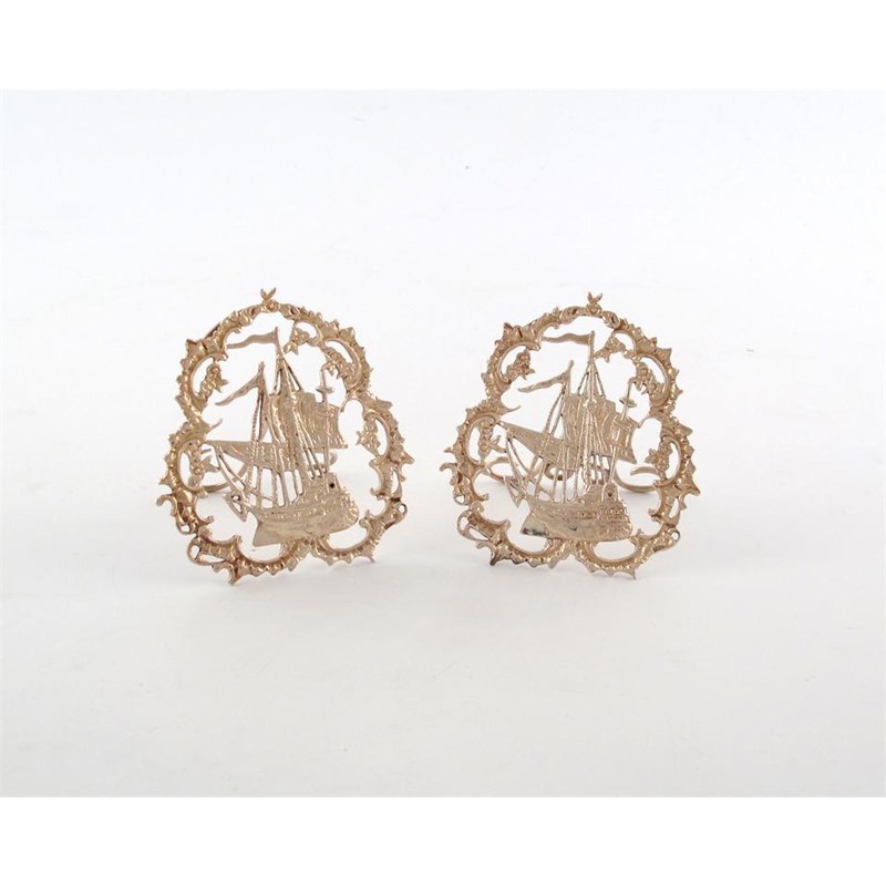 modelled as pierced galleons, within a foliate scroll border, easel backs, height 7.5cm