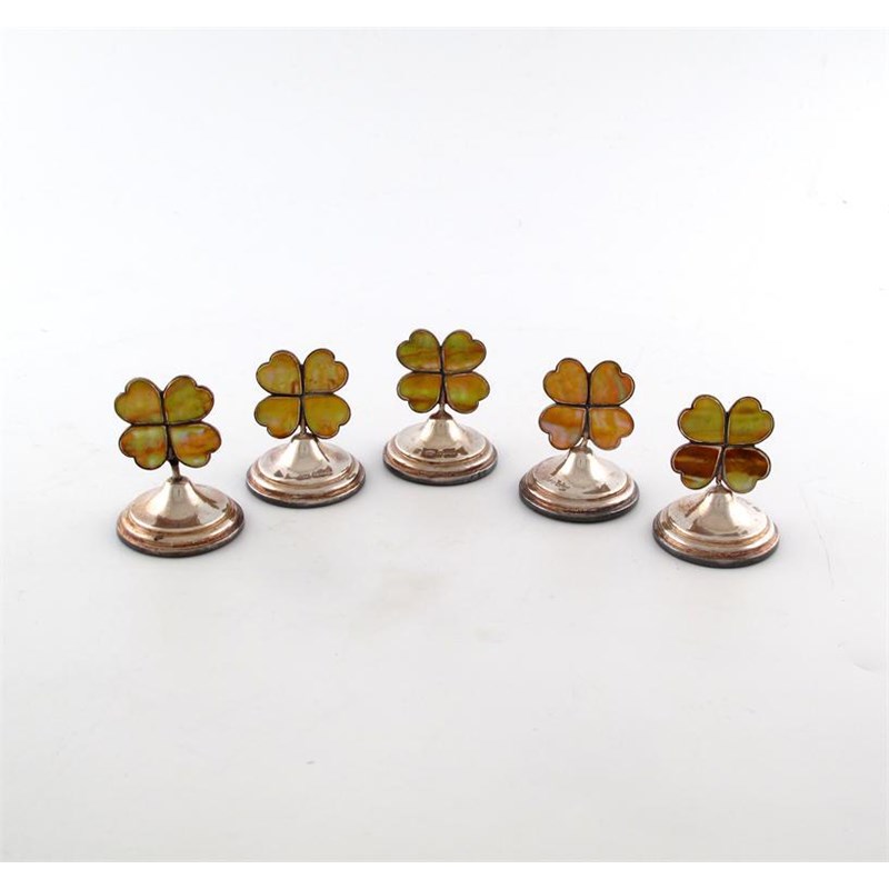 formed as four leaf clovers, on raised circular bases, height 4.5cm. (5)