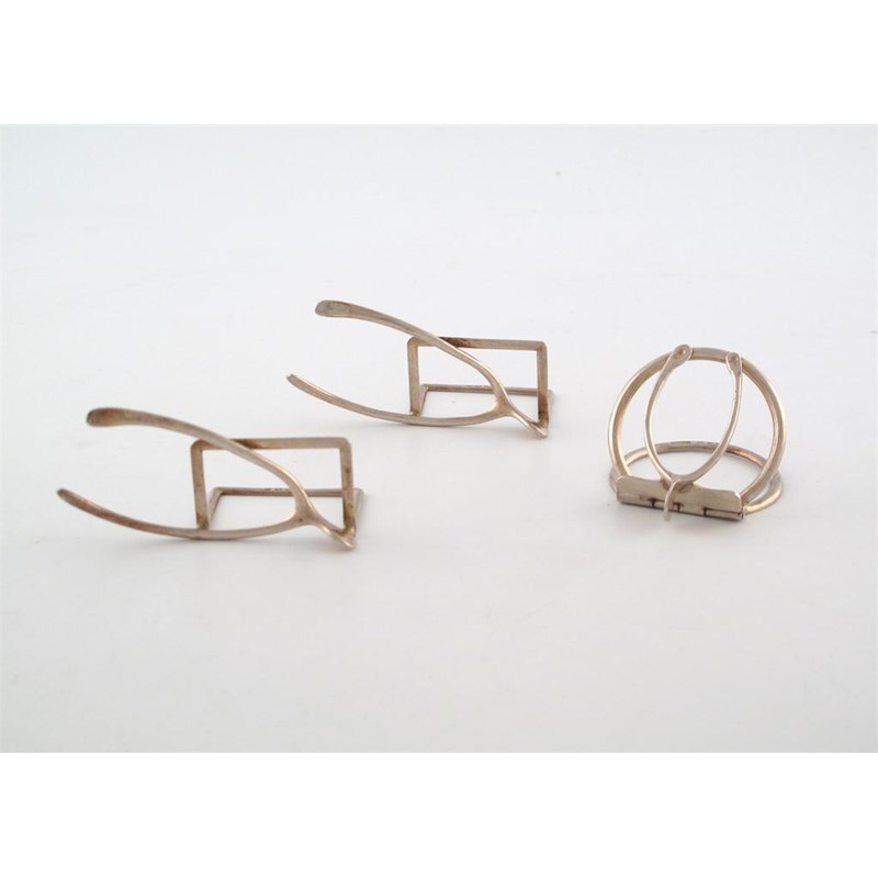 on wire-work bases, length 6.5cm, plus a single silver wish bone menu card holder on a circular base. (3)