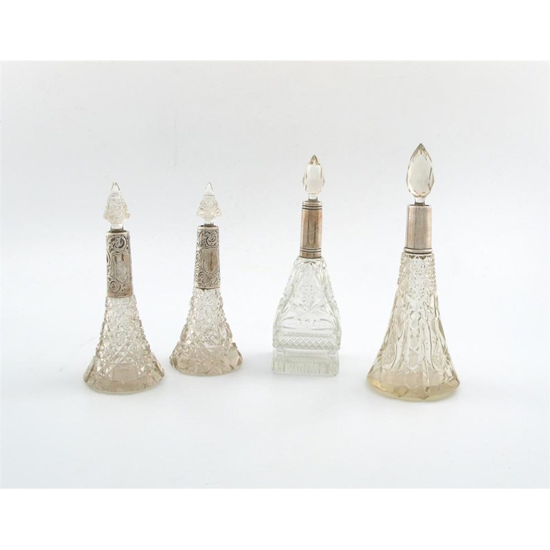 tapering circular form, cut glass body, the mount with foliate scroll decoration, plus two further silver mounted scent bottles. (4)