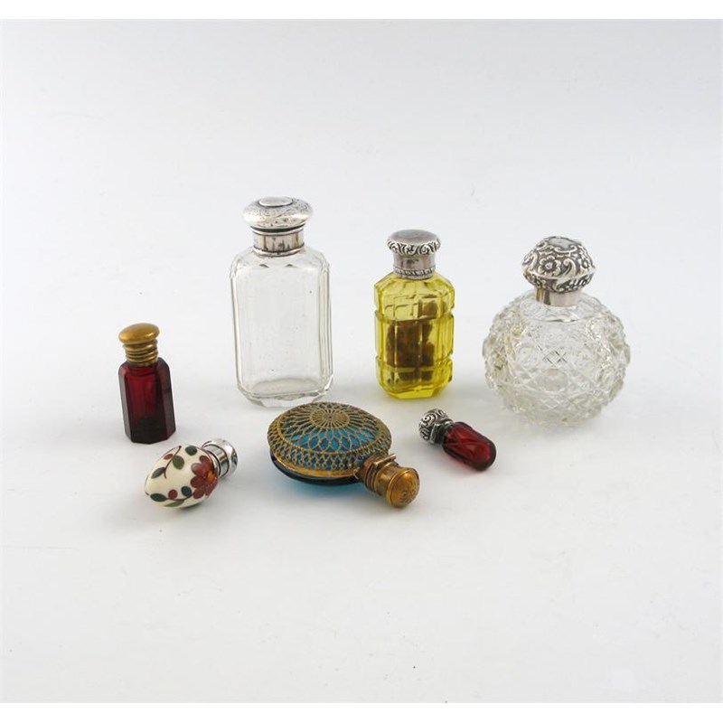 comprising: a silver mounted lemon glass scent bottle, by S. Mordan and Co, a silver mounted egg shaped scent bottle, with floral decoration, two silver mounted clear glass scent bottles, a silver mounted red glass scent bottle, and two base metal mounted coloured glass scent bottles.(7)