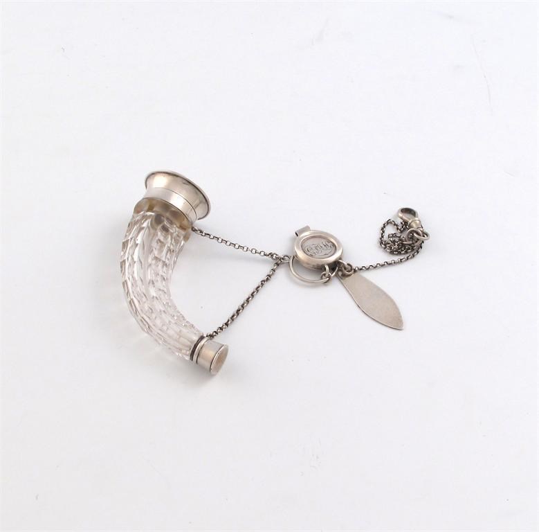 in the form of a horn, hinged cover opens to reveal a stopper, suspension chain, with an associated belt clip.