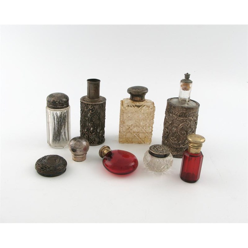 together with two silver bottle lids, a faceted glass bottle with electroplated mounts, and two ruby glass scent bottles with electroplated mounts,