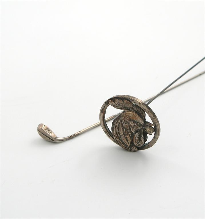 over-stamped with maker's mark of Turner and Simpson, Birmingham 1912, plus an electroplated hat pin modelled as a cockeral. (2)