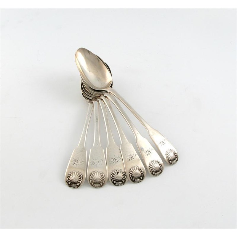 A set of six George IV Scottish provincial silver Fiddle and Shell pattern tablespoons,