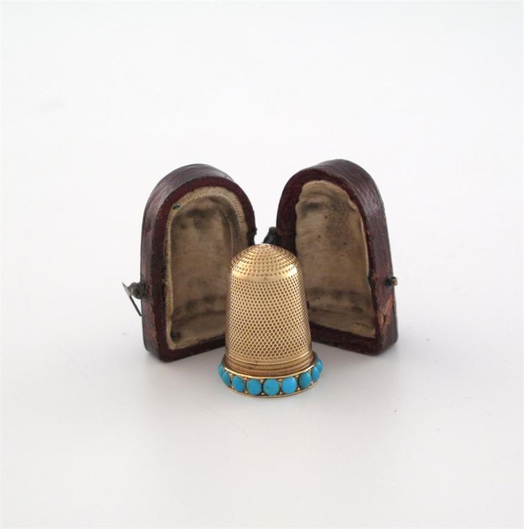 with a border of turquoise cabochons, in a fitted case, height 2.3cm, approx. weight 5g.