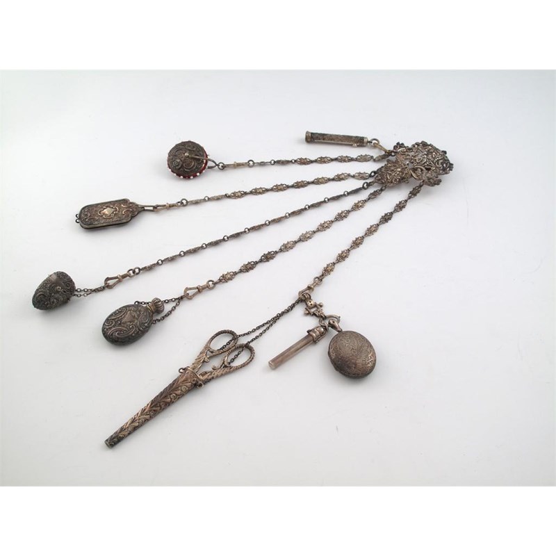with pierced foliate scroll and figural decoration, with five hanging chains, with various attachments by various makers, including: a pin cushion wheel, a locket, a scent flask, two pencils, a pair of scissors in a sheath, an egg shaped cotton reel holder, and an aide memoire.